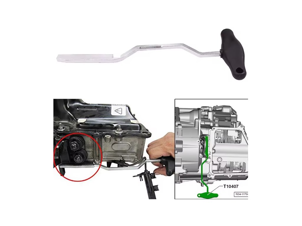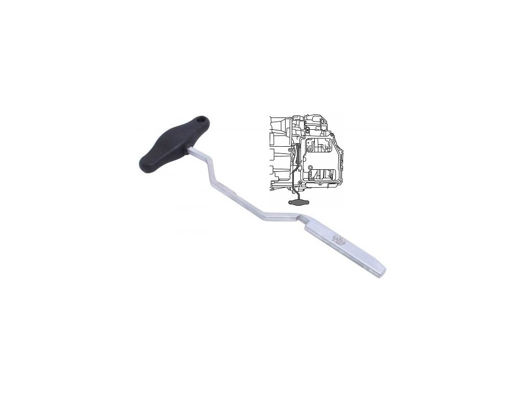 Speciálně tvarovaný přípravek pro odlehčení pístu mechatronické jednotky po vložení nástroje mezi páku spojky a převodovku u automatických DSG převodovek, 7 stupňů OEM T10407