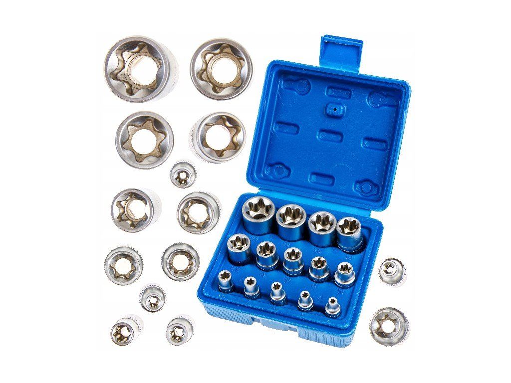 Tato komplexní čtrnáctidílná sada vnějších Torx hlavic (tzv. obrácený torx) pokrývá nejpoužívanější rozměry v moderním automobilovém průmyslu. Sada je logicky rozdělena pro tři standardní velikosti ráčen (1/4", 3/8" a 1/2"), což zajišťuje optimální přenos síly podle velikosti šroubu a dostupnosti místa.