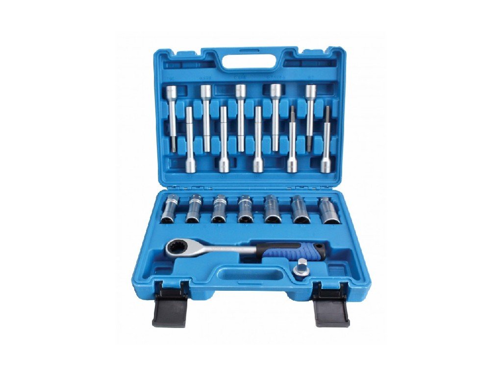 Sada na montáž a demontáž tlumičů obsahuje 17ks speciálních nástavců + 1ks průchozí ráčnu pro snadný servis tlumičů