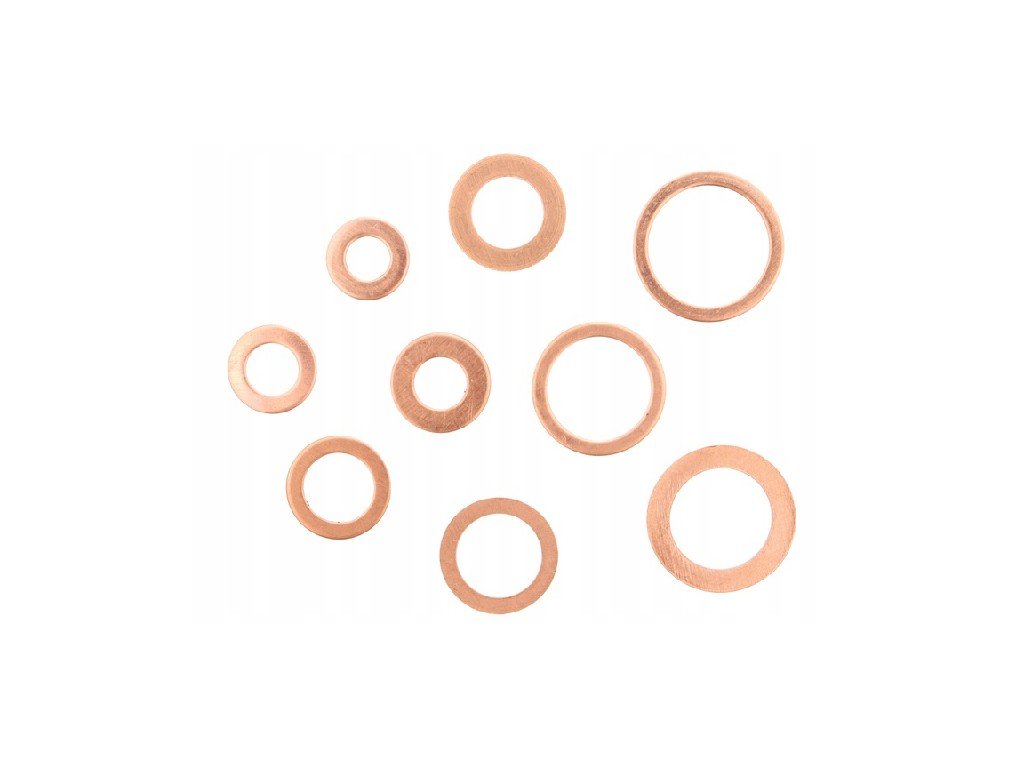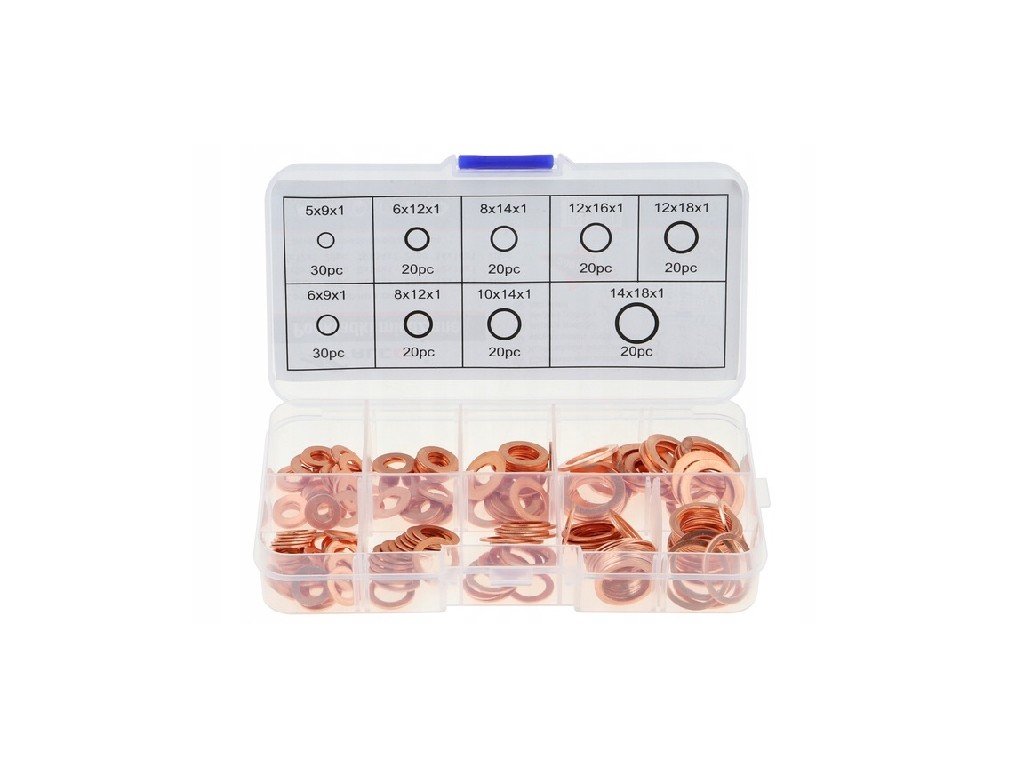 Sada měděných podložek 9-ti nejběžnějších rozměrech 200ks, vše v praktické plastové krabičce