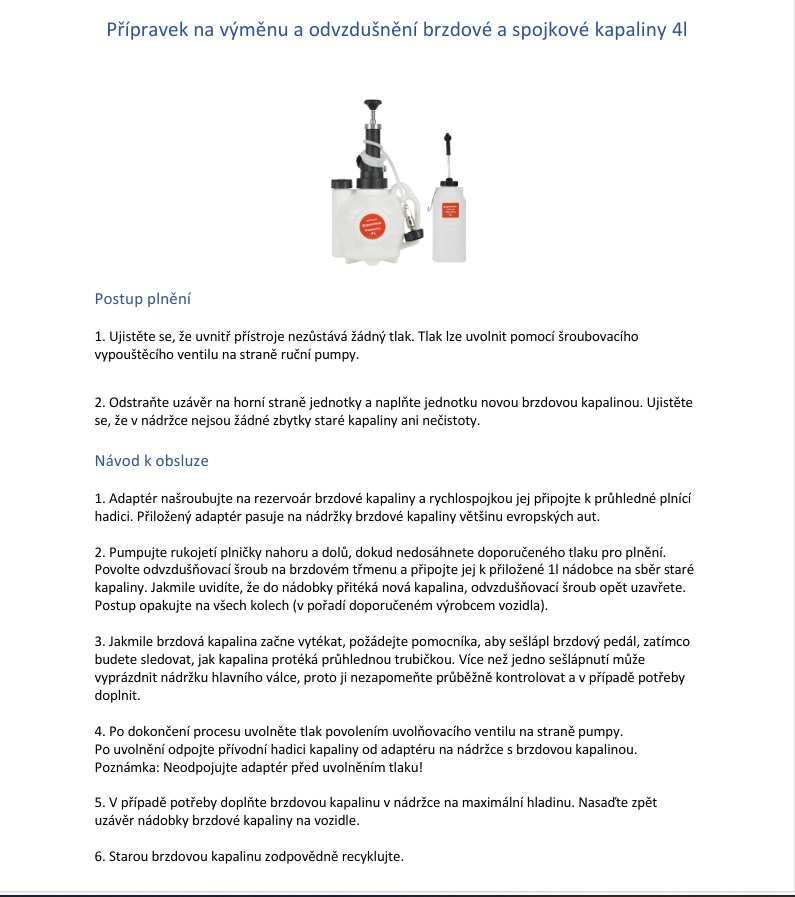 Sada na odvzdušnění brzd, výměnu brzdové kapaliny s ruční pumpičkou