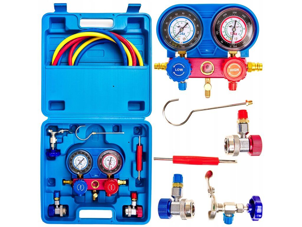 Manometry pro vysoký a nízký tlak: Sada obsahuje dvojitý manometr (manifold) pro přesné měření tlaku na vysokotlaké (červená) a nízkotlaké (modrá) straně okruhu. Správná hodnota obou tlaků je zásadní pro diagnostiku problémů s kompresorem, expanzním ventilem nebo ucpaným okruhem.