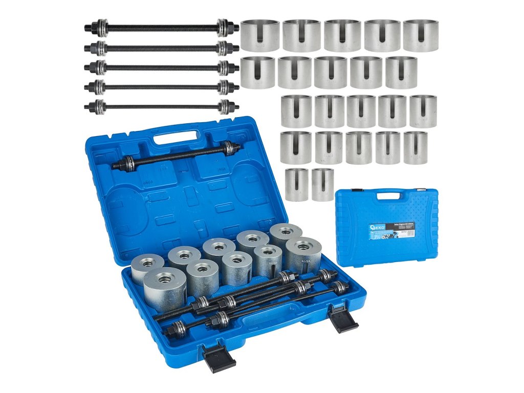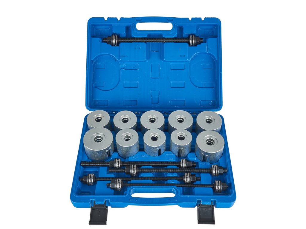 Univerzální sada výtlačných a tažných pouzder+ závitnice (27-dílná) v plastovém kufříku pro montáž a demontáž silentbloků, hydraulických, kulových a pryžových ložisek, jakož i pouzder, simerinků apod. Výtlačná pouzdra mají rozsah průměrů 34/44 až 80/90