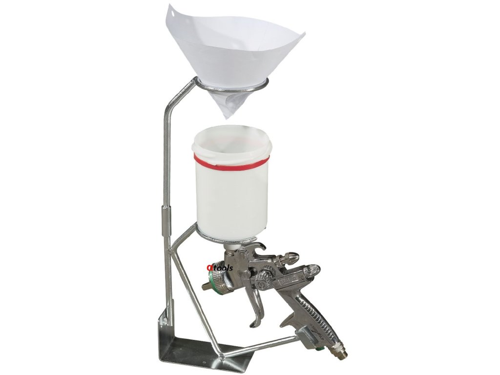 Stojan vyniká svou variabilitou a robustním ocelovým provedením. Díky promyšlené konstrukci jej můžete upevnit jak na pracovní stůl, tak na stěnu, což vám ušetří drahocenné místo v lakovacím boxu. Součástí je také odnímatelný horní držák, který slouží k pohodlnému umístění filtračního sítka při nalévání barvy.
