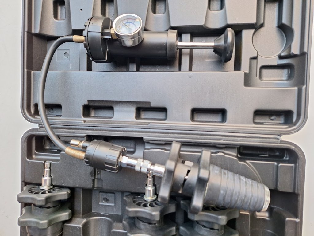 Tato diagnostická sada je nepostradatelným pomocníkem pro rychlé a přesné zjištění netěsností v celém chladicím okruhu vozidla. Na rozdíl od sad se specifickými víčky využívá tato verze univerzální konické adaptéry, které se přizpůsobí téměř jakémukoli hrdlu chladiče nebo expanzní nádobky.